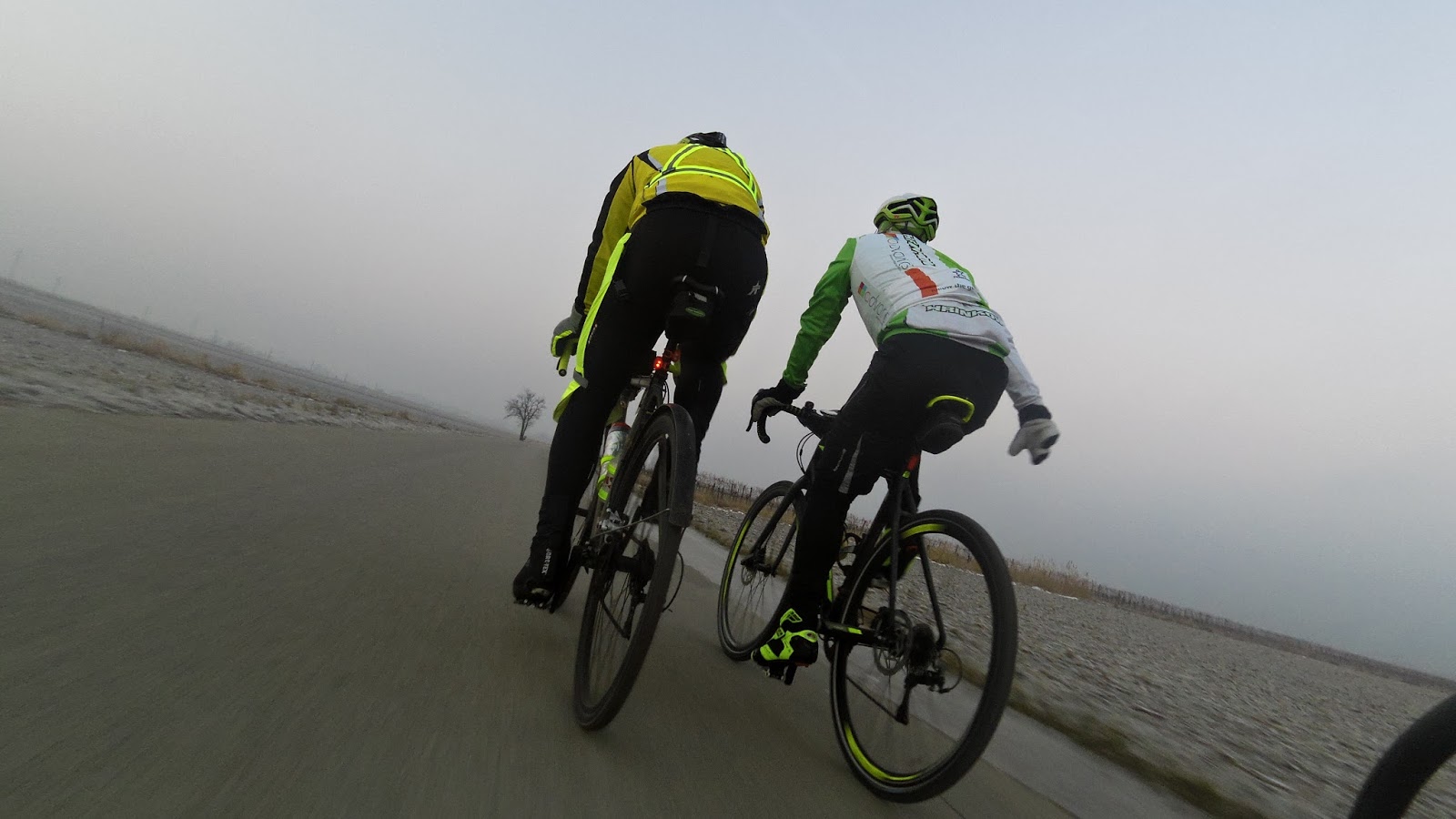 In Hegykö trennen wir uns. Michael, Manfred und ich nehmen den Original Trail in den Nationalpark. Johannes randonneurt weiter. Die Reise wird jetzt ein Abenteuer. Schnee, Eis, und vereinzelt Geher. Die Klingel im Dauereinsatz. Dank Spikes überleben wir diese Passage und erreichen Fertöújlak. Neben uns nur mehr vereinzelt Läufer. Verdammt schnelle Läufer. Beim Grenzübertritt kurz vor Apetlon sichten wir erneut die Randonneure auf der Landstraße von Pamhagen kommend. Johannes gesellt sich wieder zu uns. Die Offroad-Gang ist wieder vereint. Apetlon, Illmitz, Hölle, Podersdorf. Runde eins ist nach 4h8min Geschichte. Kurze Pause.