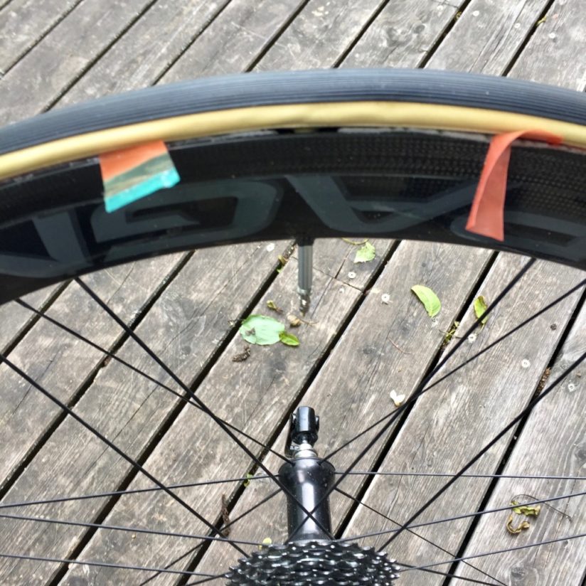 Für das Schlauchreifen kleben mit Effetto Mariposa habe ich mir ganz genau angeschaut, wie das die Profis machen. Erstmals mit einem Klebeband. Das Carogna. Soll angeblich besser kleben als das Tufo-Band und auch viel höhere Temperaturen aushalten (ja, soll … ich weiß). Das Video auf der Effetto Mariposa Webseite kenne ich auswendig.